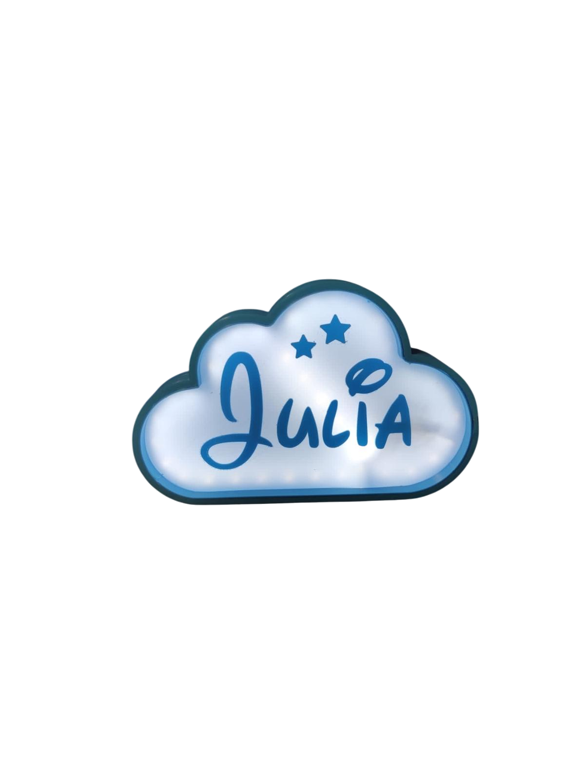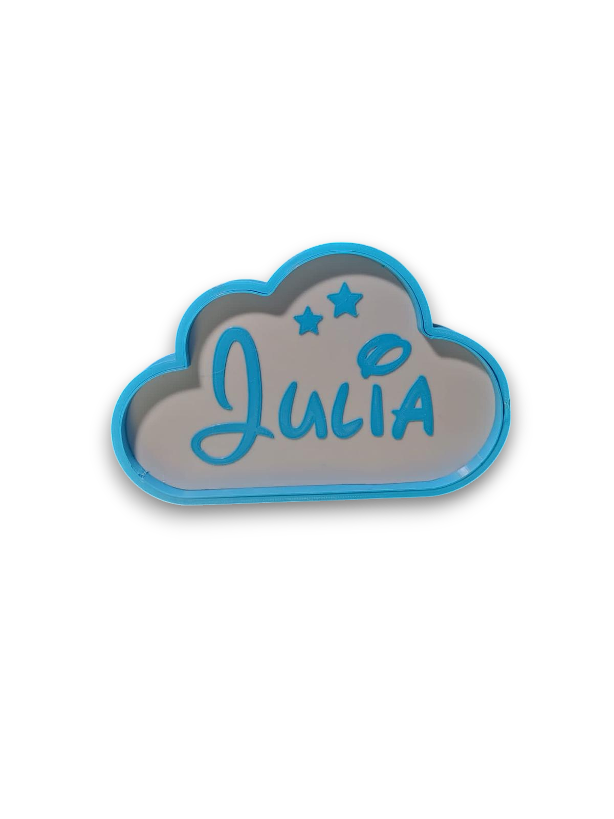 Lámpara LED diseñada e impresa en 3D, con forma de nube y nombre personalizado. Su diseño suave y envolvente crea una atmósfera cálida, perfecta para habitaciones infantiles, rincones de descanso o como regalo especial.