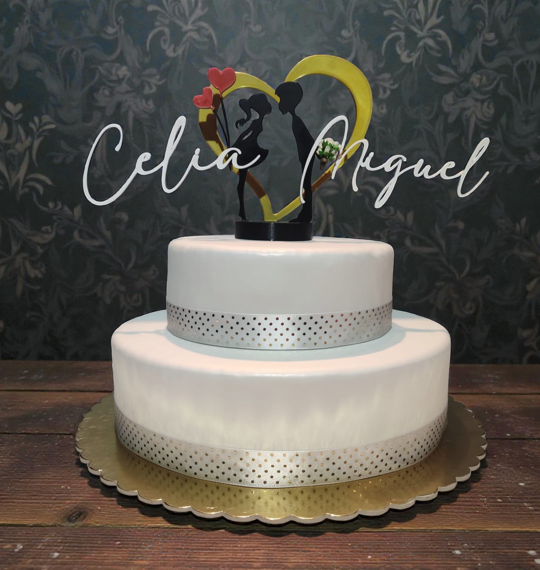 Añade un toque único y elegante a tu pastel de boda con este topper personalizado, diseñado y fabricado mediante impresión 3D. Cada pieza se realiza bajo pedido con el nombre de los novios, sus iniciales o el texto que elijas, creando un detalle totalmente exclusivo.